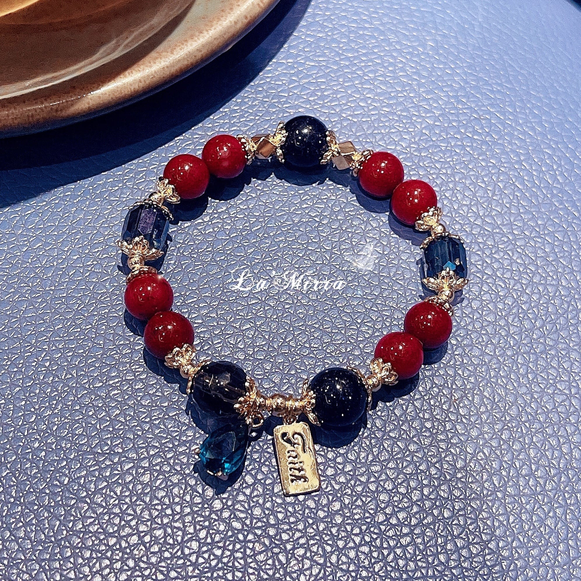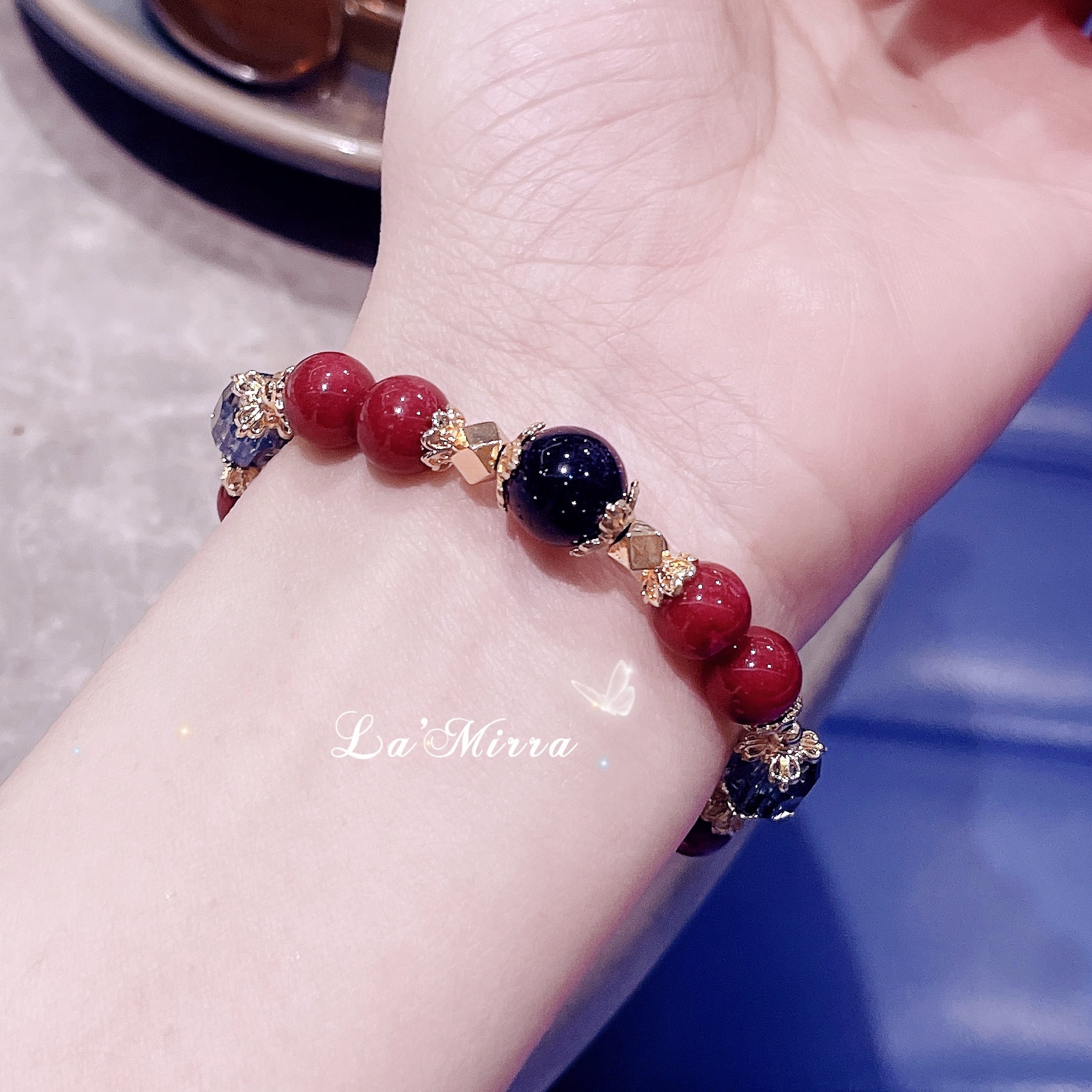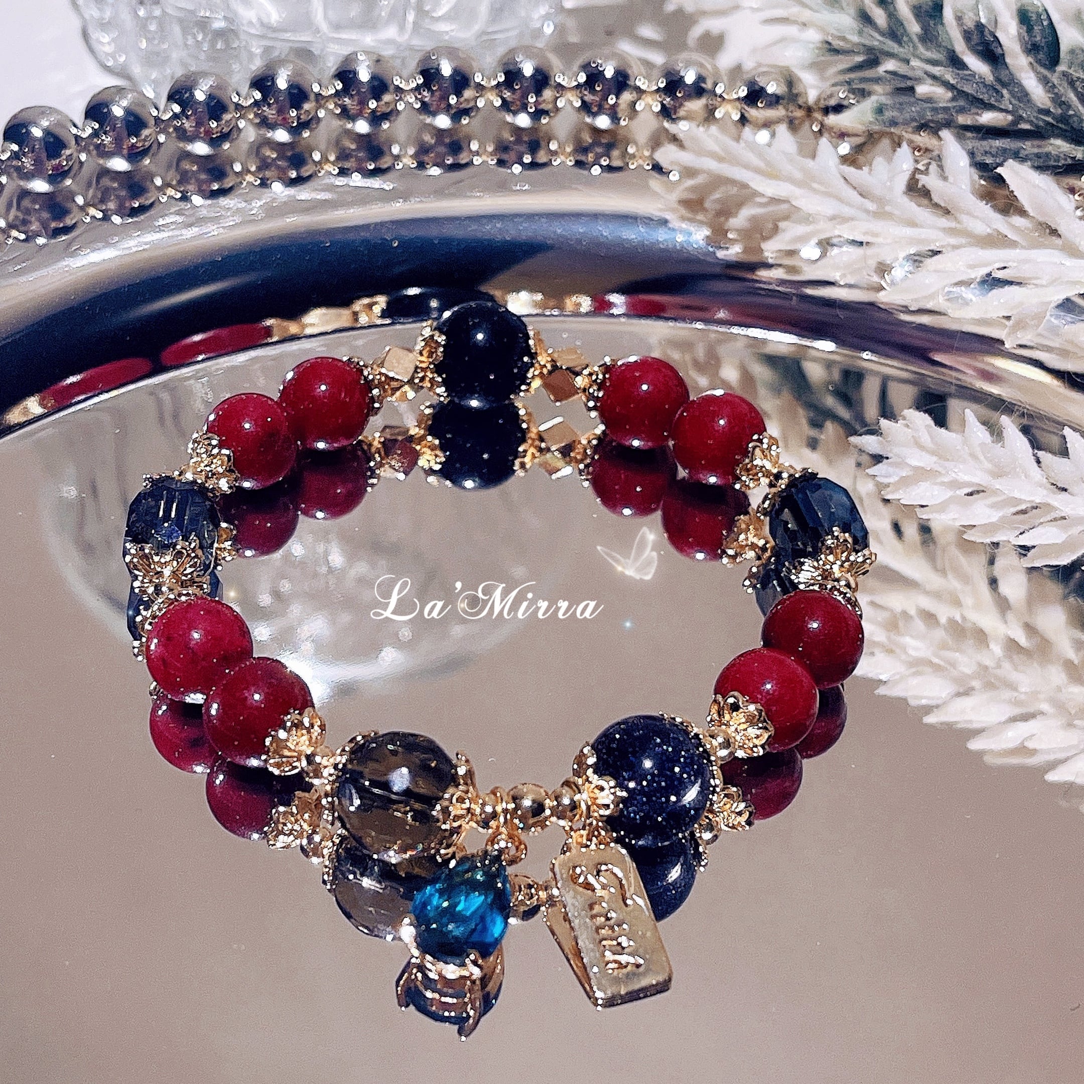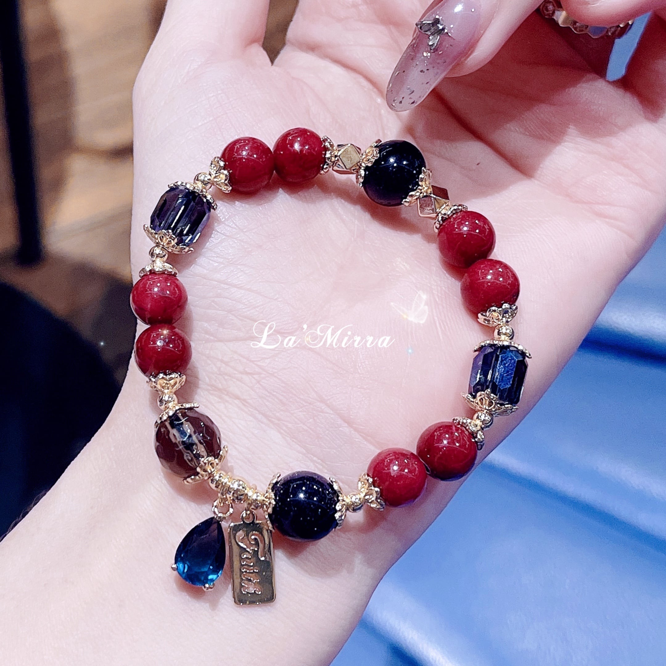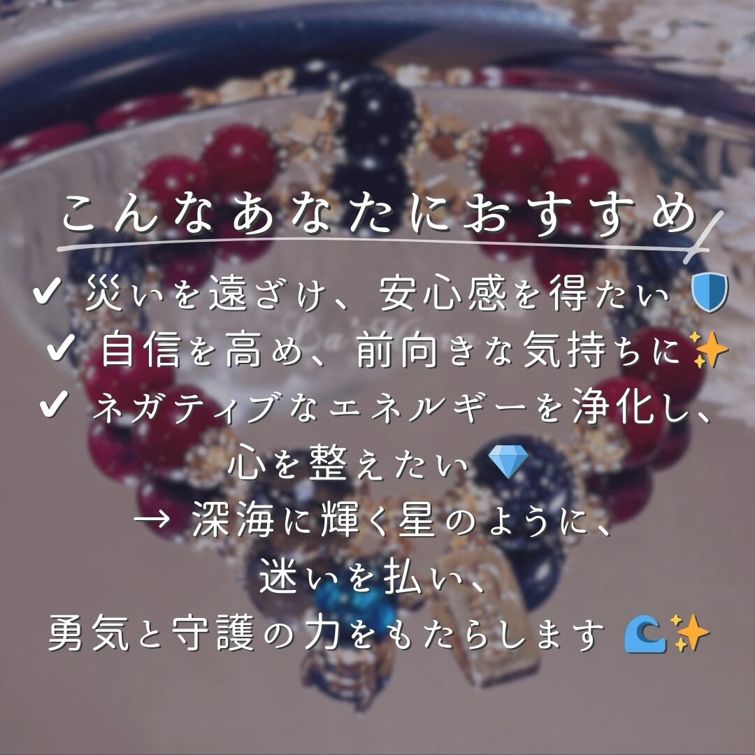 遥かなる時の流れの中で、セレーネは深海の夜に浮かぶ星々の光を集め、ひとつのブレスレットを生み出しました。深紅の朱砂石は大地の鼓動を秘め、持ち主に平安と成功をもたらします。黒曜石は古より邪を祓う護符とされ、迷いや恐れを吸い込み、強き心を支えます。